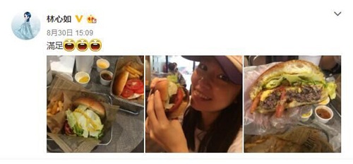 林心如的微博 林心如素顏吃漢堡 最近,林心如曬出自己與高熱量美食的合影---夾肉漢堡與薯?xiàng)l,這位準(zhǔn)媽媽還大呼:“滿足!”照片中的林心如帶著帽子遮面...