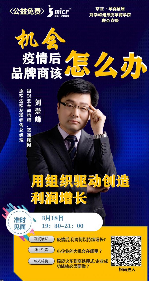 京正·孕嬰童展直播第一講即將開啟~時間:3月18日(周三)19:30【直播主題】《疫情彎道超車的新風(fēng)口,用組織驅(qū)動創(chuàng)造利潤增長》【直播導(dǎo)師】劉崇峰組織變革架構(gòu)師、咨詢...