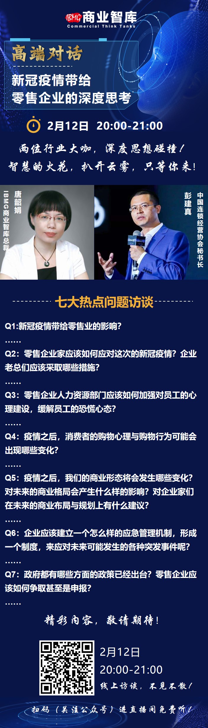 2月12日晚20:00-21:00,IBMG商業(yè)智庫總裁唐韶娟女士將對話中國連鎖經營協(xié)會秘書長彭建真先生,就當下行業(yè)面臨的機遇與挑戰(zhàn),從行業(yè)政策解讀,消費變化,應急預案,業(yè)態(tài)布...