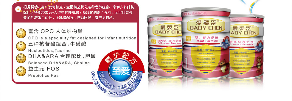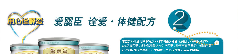 /食品法典委員會(CAC)所制定的推薦標準和中國配方奶粉食品安全國家標準,根據(jù)中國寶寶生長發(fā)育特征和需求,在原有品牌基礎(chǔ)之上,隆重推出具有中國寶寶專屬品質(zhì)的愛嬰臣嬰幼兒配方奶粉“至愛?精護配方”和“詮愛?體健配方”兩大系列產(chǎn)品,并將為中國父母提供更專業(yè)的科學喂哺和育嬰服務(wù)。