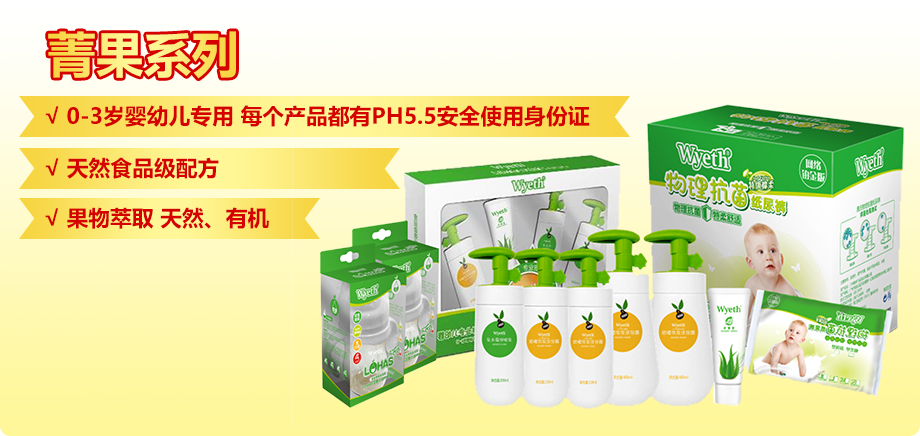 惠氏母嬰用品秉承“用醫(yī)學(xué)的態(tài)度呵護(hù)成長(zhǎng)”理念,不斷地將最新的技術(shù)和理念引進(jìn),研究和開發(fā)一系列的嬰幼兒用品,為嬰幼兒提供更加優(yōu)質(zhì)的生活,為家長(zhǎng)提供各種專業(yè)護(hù)理品和健康資訊,最大限度地保護(hù)嬰幼兒的身心健康,積極推動(dòng)中國(guó)嬰幼兒用品產(chǎn)業(yè)和市場(chǎng)的持續(xù)發(fā)展。