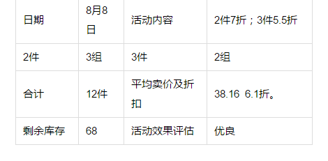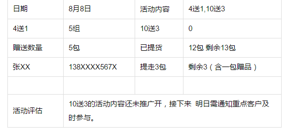 不僅需要對(duì)活動(dòng)的實(shí)際銷售情況進(jìn)行跟進(jìn)分析,也要對(duì)活動(dòng)內(nèi)容進(jìn)行評(píng)估,如果出現(xiàn)售賣情況不理想的情況,及時(shí)調(diào)整活動(dòng)內(nèi)容。 (2)某店某品牌紙尿褲做活動(dòng)四送一,十送三。 以下是店員的統(tǒng)計(jì)表格: