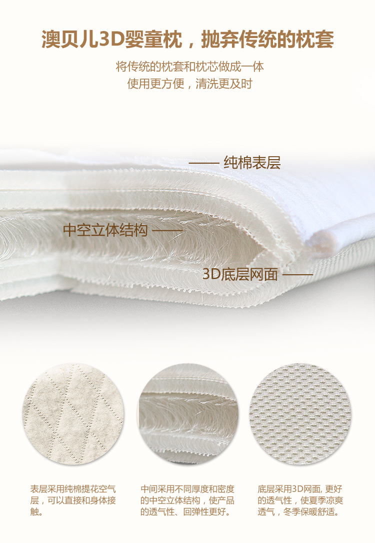 4. 安全可靠,科澳貝兒全水洗3D嬰童枕科學(xué)的將枕芯和枕套做成一體,使用更方便,清洗更容易。表層采用雙層全棉空氣層,可直接和嬰幼兒皮膚接觸,對皮膚無刺激和過敏等現(xiàn)象,吸濕性更強,透氣性更好,柔軟且舒適度好,讓寶寶安睡一整夜。澳貝兒3D嬰童枕也時刻確保您的寶寶在睡眠或者躺臥時的安全,產(chǎn)品源于一個簡單的創(chuàng)意和獨特的設(shè)計,網(wǎng)狀穿孔的高科技原料,可以均勻支持寶寶頭部的全部重量,簡單并有效,從而避免了扁頭綜合癥的發(fā)生,對于已經(jīng)產(chǎn)生變形的寶寶,澳貝兒嬰兒枕頭可以幫助更快的矯正畸形,我們采用的是特殊的面料,對您的寶寶100%安全。 |