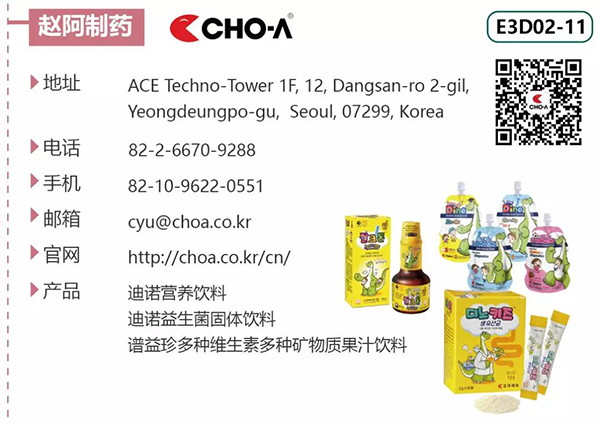 除了食品類的參展品牌外,另一家韓國(guó)知名的制藥品牌——趙阿制藥也將作為重點(diǎn)參展品牌亮相本屆展會(huì)。趙阿制藥成立于1988年, 1995年獲KGMP認(rèn)證,并在1999年于韓國(guó)KOSDAQ上市,以“助人遠(yuǎn)離疾病, 守護(hù)人類健康和幸福”為企業(yè)經(jīng)營(yíng)理念。趙阿制藥擁有200多種產(chǎn)品,包括醫(yī)藥品、保健食品和飲料,其中60多種產(chǎn)品已出口到全球28個(gè)國(guó)家。
