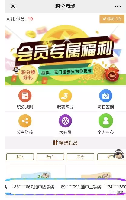 積分商城首頁(yè)展示可用積分、積分規(guī)則、我要積分、每日簽到、分享鏈接、大轉(zhuǎn)盤(pán)、個(gè)人中心。