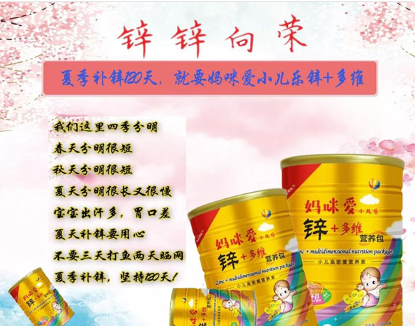 產(chǎn)品賣點(diǎn): 媽咪愛小兒樂鋅+多維營養(yǎng)包,富含多種維生素有效提高鋅吸收, 糾正微量元素缺乏或失衡,特別添加進(jìn)口水果粉并且對(duì)孩子?jì)赡鄣哪c胃沒有刺激,安全口感好,孩子容易接受,如堅(jiān)持服用可以有效緩解缺鋅癥狀。 2. 缺鋅癥狀較輕,日常食療補(bǔ)充:寶寶缺鋅的癥狀較輕,可以靠日常飲食調(diào)理。據(jù)調(diào)查,動(dòng)物性食物含鋅量遠(yuǎn)高于植物性食物,且鋅的吸收率也高。其中,牡蠣、鯡魚鋅含量最高。建議家長多給孩子吃瘦肉、豬肝、魚等動(dòng)物性食物,這類食物鋅含量高。如果寶寶采用人工喂養(yǎng),從出生后4個(gè)月起,家長應(yīng)特別注意添加富含鋅元素較多的輔食,幫助寶寶吸收鋅元素,如:瘦肉末、蛋黃、魚泥、核桃仁粉等。 媽咪愛小兒樂與你開心過盛夏! 理智補(bǔ)鋅,貴在堅(jiān)持,夏季是寶寶缺鋅的高發(fā)季節(jié),補(bǔ)鋅一定要堅(jiān)持120天! “春生夏長”從來都是不變的道理,媽媽們一定要抓住孩子補(bǔ)鋅的黃金季節(jié)——夏季,為孩子科學(xué)的補(bǔ)充鋅元素,讓孩子擁有一個(gè)受益無窮的成長季。 |