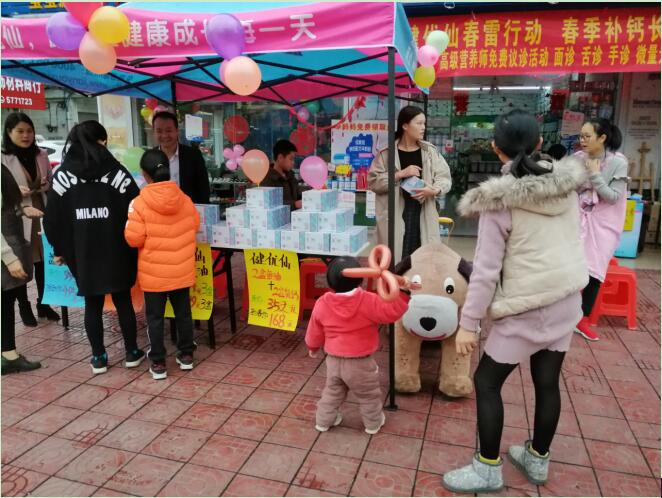 三月,健優(yōu)仙“春雷行動,春季補鈣長高”現(xiàn)場可見,除乳鈣凝膠糖果外,就屬健優(yōu)仙滴劑比較受歡迎了,當日三盒五盒小走貨,滿滿一包大走量很是普遍。店員們要頻繁往展柜、門前堆頭處補貨,才能保證需求。