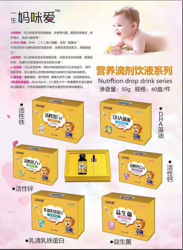 一生媽咪愛是江西康士力實業(yè)有限公司旗下品牌,成立于2018年元月,總部位于藥都之稱的江西樟樹,在董事長、總經(jīng)理高自劉先生的帶領(lǐng)下,公司秉承“臻選食材·托付未來”的企業(yè)理念,致力于嬰童產(chǎn)品研發(fā)與母嬰產(chǎn)品延伸服務(wù),打造產(chǎn)品復(fù)合型、行業(yè)全覆蓋的新興食品公司,堅持為千萬家庭提供天然綠色、營養(yǎng)均衡、益智趣味的中高端嬰童產(chǎn)品。 一生媽咪愛滴劑,最大的亮點是可以舌下含服吸收,直接透過黏膜組織滲透到微血管,不需要經(jīng)過腸胃道,能高效進(jìn)入血液中,達(dá)到全身循環(huán)利用的效果。一生媽咪愛滴劑營養(yǎng)系列,選擇特級初榨甘油為基質(zhì),用果汁來調(diào)節(jié)口感,味道好,寶寶不抗拒。采用滴劑形式,方便用量控制,隨需而取。棕色瓶裝,減少氧化,營養(yǎng)純度更高,吸收更好! ![]() |