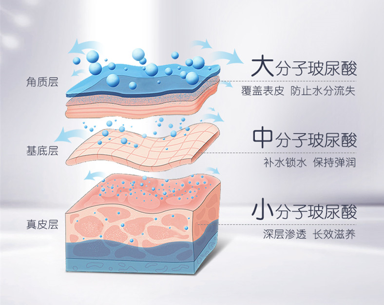 大分子透明質(zhì)酸可以在皮膚表面形成一層透氣的薄膜,使皮膚光滑濕潤(rùn),同時(shí)可以阻隔外來(lái)細(xì)菌、灰塵、紫外線(xiàn)的侵入,保護(hù)皮膚免受侵害; 中分子透明質(zhì)酸可以緊致肌膚,長(zhǎng)久保濕; 小分子透明質(zhì)酸能滲入真皮,能促進(jìn)皮膚營(yíng)養(yǎng)吸收,增加皮膚彈性。