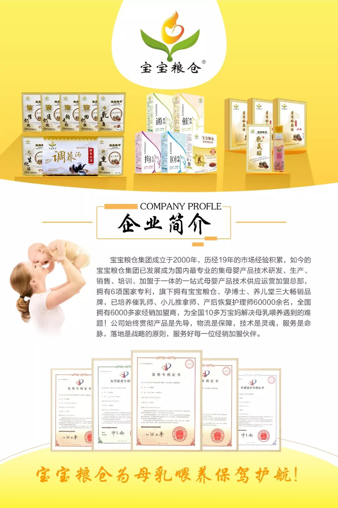 創(chuàng)辦于2000年的寶寶糧倉(cāng)集團(tuán)如今已經(jīng)擁有6項(xiàng)國(guó)家專利,旗下?lián)碛袑殞毤Z倉(cāng)、孕博士、養(yǎng)兒堂三大暢銷品牌,已培養(yǎng)催乳師、小兒推拿師、產(chǎn)后恢復(fù)護(hù)理60000余名,全國(guó)擁有6000多家經(jīng)銷加盟商,為全國(guó)10多萬(wàn)寶媽解決母乳乳喂養(yǎng)遇到的難題。開(kāi)創(chuàng)至今,寶寶糧倉(cāng)一直秉承著以客戶至上的發(fā)展宗旨,用不斷積累的成熟行業(yè)經(jīng)驗(yàn),幫助更多有志之士共創(chuàng)健康行業(yè)的輝煌。寶寶糧倉(cāng)期待社會(huì)各界人士的加盟與合作,攜手關(guān)愛(ài)母嬰健康!