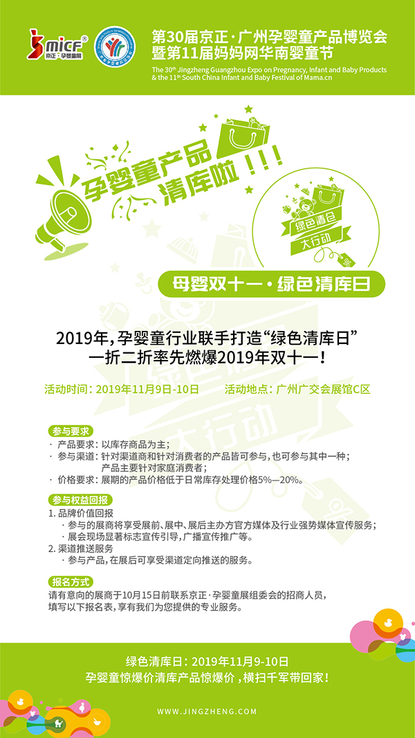 新零售時代,機遇與挑戰(zhàn)并存。目前孕嬰童行業(yè)面臨的產(chǎn)能過剩、庫存積壓等困境。為助力企業(yè)擺脫困局,第30屆京正·廣州孕嬰童產(chǎn)品博覽會暨第11屆媽媽網(wǎng)華南嬰童節(jié)開展期間,主辦方京正國際特別策劃針對廠商清理庫存的“母嬰雙十一·綠色清庫日”活動。 本次活動旨在攜手各大品牌參展商清減不必要的庫存,加快企業(yè)現(xiàn)金流周轉,同時深度開拓華南地區(qū)的渠道市場,實現(xiàn)企業(yè)、渠道商、終端消費者和平臺的多贏格局。 本次活動的參與對象僅針對第30屆京正·廣州孕嬰童展的參展商,本次活動時間為11月9日、10日兩天。參與活動的產(chǎn)品以庫存商品為主,參展商以優(yōu)惠的價格讓利給消費者,打造針對家庭消費者的線下雙十一購物狂歡節(jié)。為了讓參展商實現(xiàn)真正讓利給消費者的同時,又能夠達到集中清倉的效果,本次活動期間產(chǎn)品價格將低于日常庫存處理價格的5%—20%。 搭設平臺,為行業(yè)服務,是京正國際永遠不變的宗旨。凡是參與本次活動的參展企業(yè),主辦方京正國際將為其帶來品牌價值回報和產(chǎn)品的渠道的定向推廣服務。展前、展中、展后,主辦方官方媒體及行業(yè)強勢媒體將對參與展商的產(chǎn)品進行集中宣傳推廣服務,展會現(xiàn)場顯著標志宣傳引導、廣播宣傳推廣,展后還可享受渠道定向推送服務。 本次活動提報截止時間為10月16日,有意向參與的展商請于此前聯(lián)系京正·孕嬰童展組委會的招商人員,填寫活動報名表,享有我們?yōu)槟峁┑膶I(yè)服務。 更多活動信息請關注京正孕嬰童展官方微信、官方微博 活動時間:2019年11月9日-10日 活動地點:廣州廣交會展館C區(qū) 報名截止時間:10月15日