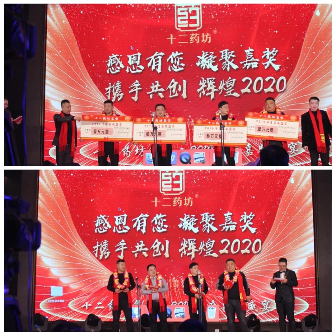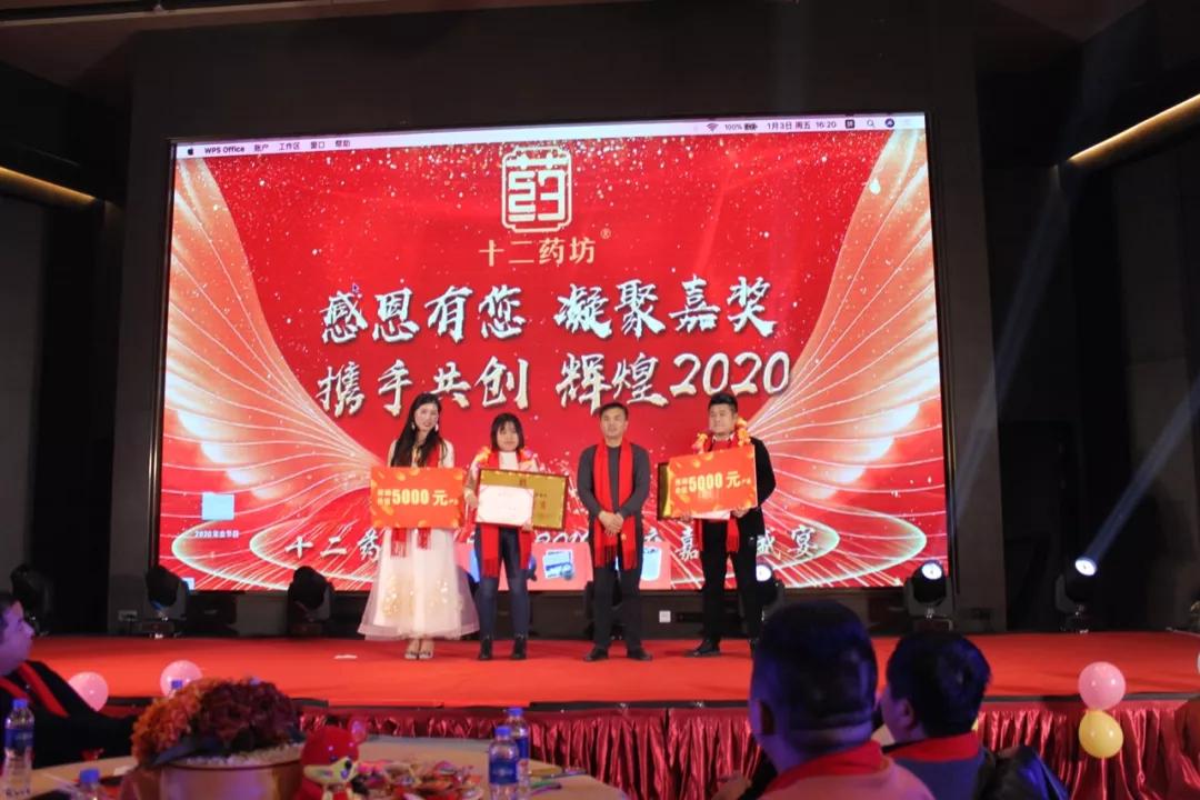市場部節(jié)目感動(dòng)全場觀眾 市場部節(jié)目之后,晚會到了第二輪頒獎(jiǎng)環(huán)節(jié),第二個(gè)獎(jiǎng)項(xiàng)是“十二藥坊集團(tuán)2019年省級優(yōu)秀戰(zhàn)略合作伙伴”,獲獎(jiǎng)的是“陜西省省總楊興國”,“廣西省省總楊建磊”,“四川省省總李德亮”,“遼寧省省總李傳君”。他們緊跟集團(tuán)步伐,結(jié)合各省實(shí)際情況,調(diào)整經(jīng)營模式,在2019年收獲滿滿。他們誠待天下,不斷完善自我,鞏固與集團(tuán)的各項(xiàng)合作,他們是集團(tuán)省級醫(yī)藥合作發(fā)展的堅(jiān)守者和執(zhí)著者。陜西省自8月至今的總業(yè)績?yōu)?28萬元;廣西省自5月至今的總業(yè)績?yōu)?8萬元;四川省自7月至今的總業(yè)績?yōu)?8.9萬元;遼寧省自7月至今的總業(yè)績?yōu)?1萬元。集團(tuán)董事長楊總及總裁楊總為四位優(yōu)秀省總授予榮譽(yù)獎(jiǎng)牌及證書,并以4萬現(xiàn)金獎(jiǎng)勵(lì)陜西省總;以3萬元現(xiàn)金獎(jiǎng)勵(lì)廣西省總;以2萬元現(xiàn)金獎(jiǎng)勵(lì)四川省總;以1萬元現(xiàn)金獎(jiǎng)勵(lì)遼寧省總,愿他們在2020年更上一層樓,各省市場紅紅火火,越來越旺。