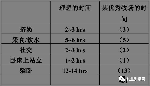 牛槽設(shè)計(jì)要合理 第一,設(shè)計(jì)牛槽時(shí)要注意合適的落差,如果不合適會(huì)導(dǎo)致采食姿勢(shì)不正確,因?yàn)閴虿坏搅希9蛑墒常? 第二,牛槽不合理的設(shè)置也會(huì)導(dǎo)致出現(xiàn)甩料現(xiàn)象。據(jù)翼鯤中國的何筠,張廷青報(bào)道,蒼蠅蚊子過多也可導(dǎo)致甩料,每頭牛周圍1-150個(gè)蒼蠅就可導(dǎo)致每10頭牛有1頭牛甩料,一個(gè)千頭的牧場(chǎng)每個(gè)月的飼料浪費(fèi)就要達(dá)2噸以上,植物提取物的牛司令通過封閉蒼蠅的氣門可以達(dá)到很好的去蚊蠅效果,并且對(duì)飼料和牛奶是安全的。 通過后肢關(guān)節(jié)評(píng)分判斷問題的原因 后肢關(guān)節(jié)的評(píng)分 1分是完好無損; 2分是輕微的磨損,磨損面積小于一個(gè)硬幣;3分是嚴(yán)重的磨損,磨損面積大于一個(gè)硬幣;4分是輕微的腫脹; 5分是嚴(yán)重的腫脹。 出現(xiàn)腫脹的可能原因:一是臥床墊料太低、太少,形成一個(gè)坑而產(chǎn)生摩擦;另一方面可能由于臥床太短,牛腿伸出臥床與后端的坎墻摩擦導(dǎo)致。 如果前肢關(guān)節(jié)出現(xiàn)磨損的可能原因:一是臥床太短,或是墊料太硬,運(yùn)動(dòng)場(chǎng)是磚頭或水泥地,墊料不足,平時(shí)墊料不維護(hù)等。 如果肩部出現(xiàn)磨損,可能由于柱子太低的或頸夾太低,導(dǎo)致組織受到壓迫而損傷,也可能是由于推料不及時(shí)導(dǎo)致的。 不要忽略人和牛的關(guān)系對(duì)牛造成的影響 管理者跟牛形成的關(guān)系對(duì)牛的影響很大,應(yīng)盡量關(guān)系和諧,管理者對(duì)牛的友善不需要任何投入。 奶牛躺臥舒適的重要性和改善措施 躺臥時(shí)間越長,牛奶產(chǎn)量越大。3個(gè)原因: 第一,奶牛在躺著時(shí),血液會(huì)增長到25%,奶產(chǎn)量因此會(huì)相應(yīng)增加。 第二,由于中國牧場(chǎng)乳房炎主要是環(huán)境性乳房炎,因此奶牛躺在干凈的臥床上,會(huì)降低乳房炎發(fā)病率。 第三,躺臥時(shí)間增加,相應(yīng)站立在水泥地面的時(shí)間就會(huì)降低,從而降低蹄病的發(fā)生。奶牛理想的時(shí)間管理如表1所示。管理奶牛的過程就是管理奶牛的時(shí)間分配,一句話概況就是讓奶牛在合適的時(shí)間做合適的事情。 表1 奶牛時(shí)間管理