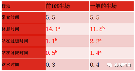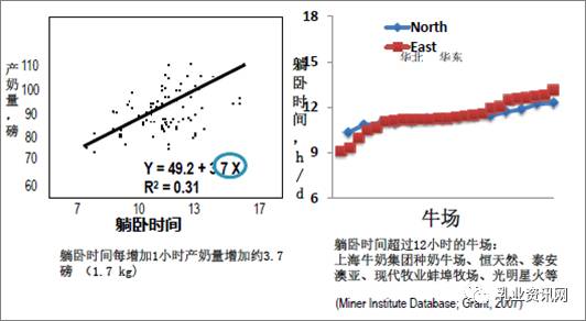 圖2 奶產(chǎn)量與躺臥時(shí)間的關(guān)系 圖2左圖中每一個(gè)點(diǎn)代表一個(gè)大型牧場(chǎng)牛場(chǎng),通過直線關(guān)系,可以看出,躺臥時(shí)間每增加1小時(shí),產(chǎn)奶量會(huì)增加3.7磅(1.7公斤)。 圖2右圖是躺臥時(shí)間超過12h以上的牛場(chǎng),這些牧場(chǎng)產(chǎn)奶量非常高,如澳亞等。 表2 單產(chǎn)前10%的牛場(chǎng)與一般牛場(chǎng)的對(duì)比