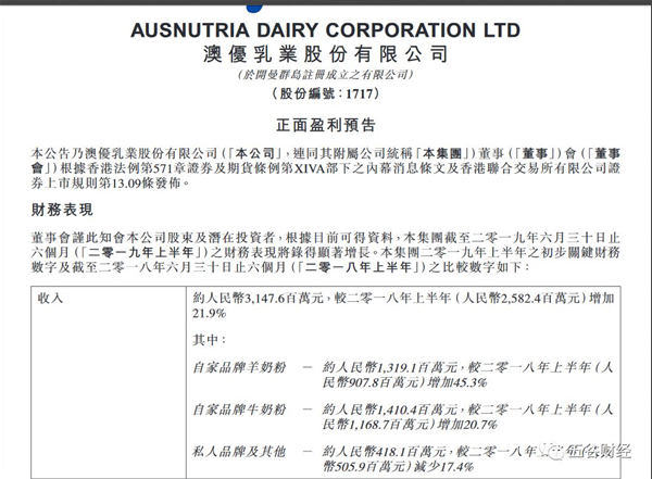 7月31日,澳優(yōu)(01717.HK)在聯(lián)交所發(fā)布了正面盈利預(yù)告,2019年上半年,預(yù)計收入約為31.476億元,相較于2018年上半年25.824億元,增幅在22%左右;經(jīng)調(diào)整本公司權(quán)益持有人應(yīng)占利潤約為4.349億元,與2018年上半年2.655億元相比,增幅在64%左右。