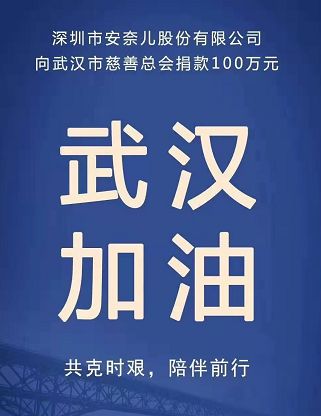 深圳市安奈兒股份有限公司 1月29日,安奈兒公司向武漢市慈善總會捐款100萬元,用于當(dāng)?shù)胤揽鼐o急物資采購等抗擊新型肺炎疫情之需。安奈兒Annil向所有奮戰(zhàn)在疫情防控一線的醫(yī)務(wù)工作人員致以最崇高的敬意。