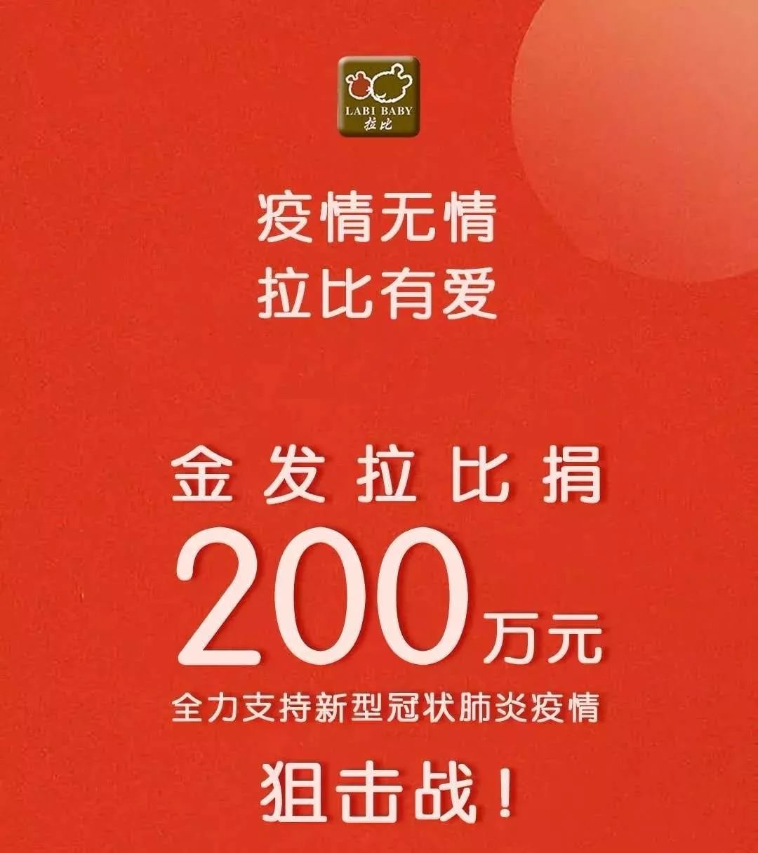金發(fā)拉比婦嬰童用品股份有限公司 為支援抗擊疫情,金發(fā)拉比創(chuàng)始人林若文女士已通過慈善機(jī)構(gòu)率先籌集并募捐了善款和洗手液及消毒用品,分別派送給奮戰(zhàn)在疫情一線的醫(yī)護(hù)人員以及留滯在汕頭市的武漢婦女兒童。之后又通過汕頭市慈善總會自愿捐贈人民幣現(xiàn)金100萬元和100萬元貨值的母嬰洗手泡泡等清潔消毒產(chǎn)品,合計200萬元。其中100萬元現(xiàn)金定向捐贈給武漢地區(qū)兒童醫(yī)院,用于支持武漢地區(qū)婦嬰童抗疫;100萬元物資專用于汕頭市各學(xué)校、幼兒園、醫(yī)院及其它相關(guān)抗疫情單位等。