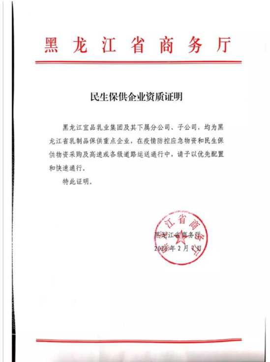 為了確保疫情期間市場穩(wěn)定供給,歐士達母公司宜品乳業(yè)集團有黑龍江商務廳為其開具的民生保供企業(yè)資質(zhì)證明,有了這個綠色通行證,相當于保證了物流運輸這條“生命線”