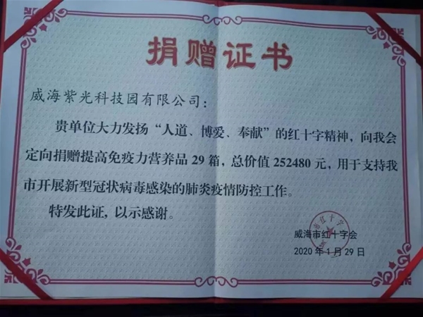面對疫情蔓延全國的嚴(yán)峻形勢,威海紫光立即行動,1月29日,向威海紅十字會捐贈價值25萬多元用于提高免疫力的營養(yǎng)保健品。