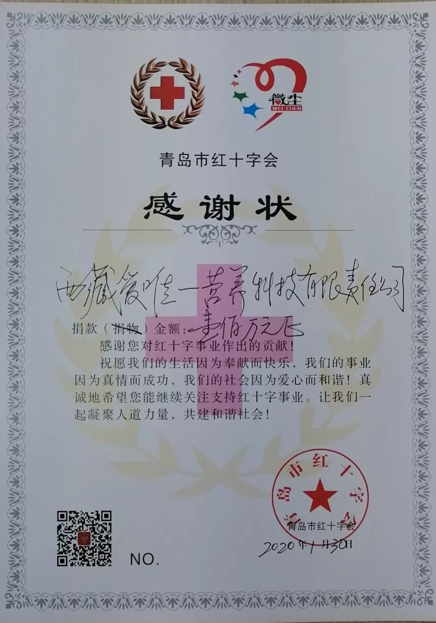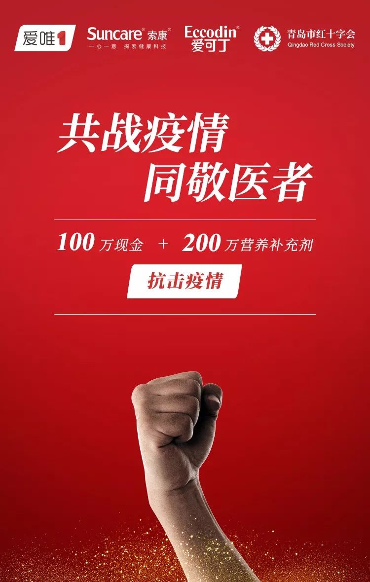 為支持抗擊疫情,2020年1月30日,索康愛可丁奶粉攜手愛唯一啟動捐贈計劃,向青島紅十字會捐贈現(xiàn)金及營養(yǎng)補充劑共300萬。 其中,100萬元人民幣已于1月30日匯款至青島紅十字會,用于購買防護服、口罩、消毒液等醫(yī)療防護用品等。 價值200余萬元的營養(yǎng)補充劑將根據(jù)需要用于白衣天使等辛苦工作在戰(zhàn)役一線人員及家屬使用。