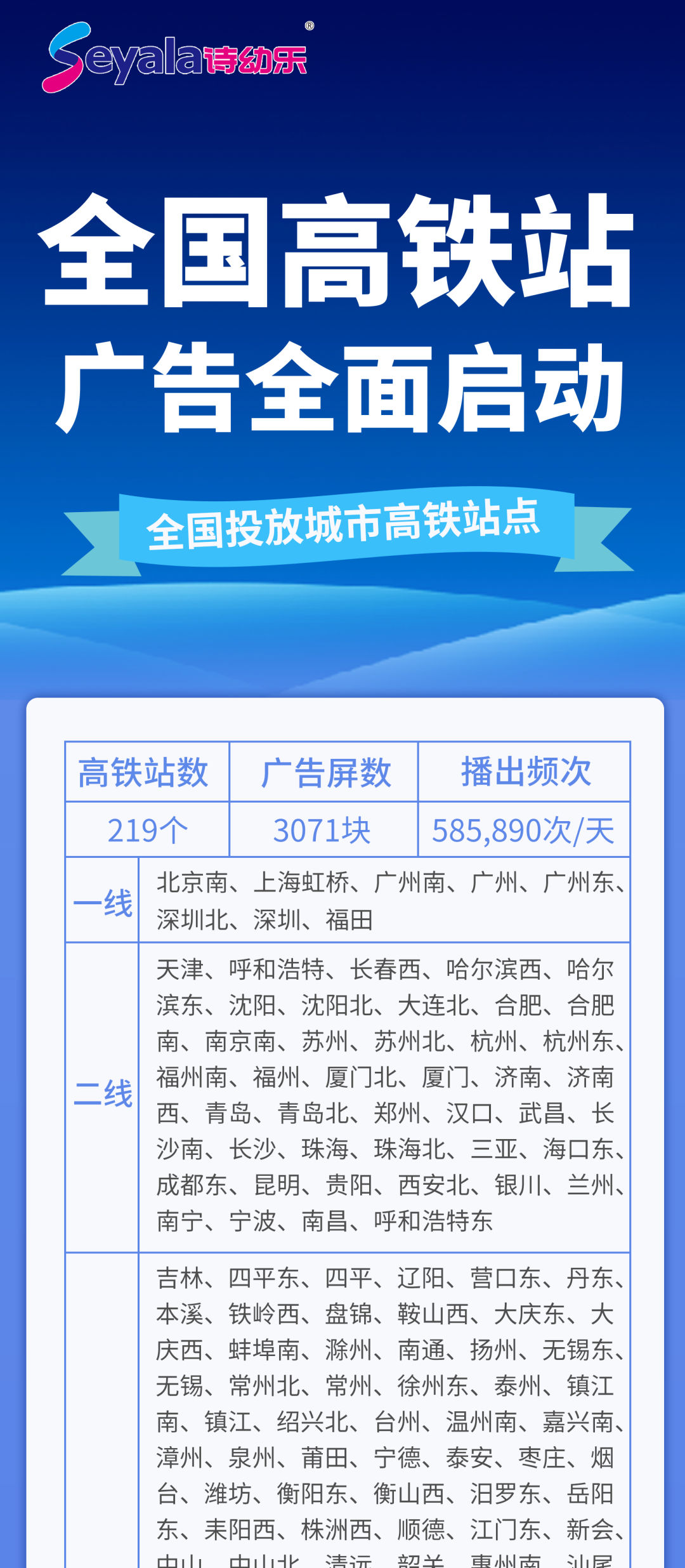 2019年1月28日至2月10日春運(yùn)期間,詩(shī)幼樂宣傳廣告將覆蓋全國(guó)219個(gè)城市高鐵站點(diǎn),播出頻次高達(dá)58萬(wàn)次/天。全國(guó)高鐵站內(nèi)隨處都能發(fā)現(xiàn)詩(shī)幼樂的身影,而詩(shī)幼樂也將在全國(guó)219個(gè)城市高鐵站點(diǎn)陪伴大家回家過年哦~