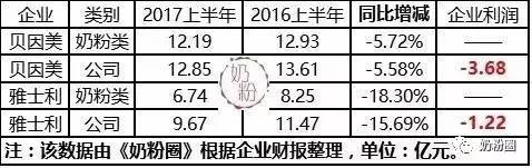 從利潤方面來看,伊利具有絕對值的優(yōu)勢,其奶粉及奶制品板塊毛利率56.74%,銷售占比9.13%,但毛利貢獻(xiàn)達(dá)到了13.56%;此外,健合集團的確厲害,悶聲發(fā)大財?shù)闹靼,半年利潤竟超過10億,僅比營業(yè)規(guī)模近300億的蒙牛少0.7億,數(shù)據(jù)我反復(fù)看了幾遍,確認(rèn)無誤才敢制表。其成人營養(yǎng)及護理等發(fā)展很快,利潤豐厚,而合生元嬰幼兒奶粉占比46.8%,更名為健合集團也是情理之中。 乳業(yè)高級研究專家宋亮告訴《奶粉圈》新媒體,當(dāng)前的奶粉形勢在回暖,但還不是太好,市場混亂,產(chǎn)能過剩,價格體系混亂,競爭惡劣,這種環(huán)境條件下,有增長的企業(yè)都不容易,多多少少都有客觀的因素在推動他們?nèi)〉煤玫某煽,三元和澳?yōu)一方面是體量偏小,另一方面是產(chǎn)品和市場策略得當(dāng),很好地規(guī)避了當(dāng)前市場的整體混亂,受到的影響。欢仙鸵晾脑鲩L,在根本上來說,是企業(yè)管住了自己銷售團隊的穩(wěn)定性,能夠管控住市場終端的產(chǎn)品,能夠運用好的運營策略,在市場表現(xiàn)上總會有相對不錯的表現(xiàn)。伊利2016年奶粉業(yè)績整體下滑了15%,但今年上半年加快了市場整體的鋪貨步伐,強化了終端消費者的培訓(xùn),采用多種方式加速了動銷,穩(wěn)定性很強,市場恢復(fù)能力很強。 3、兩家虧損的企業(yè) 相比之下,我們再看看貝因美和雅士利兩家企業(yè),業(yè)績下滑,出現(xiàn)虧損。