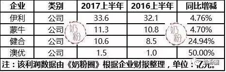 據(jù)上圖,以上企業(yè)都迎來了奶粉業(yè)績的增長,且超過行業(yè)增長速度,加上飛鶴、圣元、君樂寶等上半年的銷量增幅,行業(yè)集中度明顯增加。我們也可以看到,伊利、澳優(yōu)、三元奶粉業(yè)務(wù)增長都高于公司整體業(yè)績增長,成長較快,權(quán)重增加;而蒙牛、合生元奶粉業(yè)務(wù)增長都低于公司整體業(yè)績增長。合生元的財報顯示其嬰幼兒奶粉增長13.77%至16.61億元,其中高端及超高端奶粉增長了18.3%。三元財報重點提及了公司聚焦主力產(chǎn)品和高端產(chǎn)品,提高中高端產(chǎn)品占比,培養(yǎng)高端明星產(chǎn)品,如三元極致 A2β -酪蛋白,三元藍(lán)標(biāo)愛力優(yōu)奶粉等;伊利財報提及公司聚焦戰(zhàn)略,實施精準(zhǔn)營銷,“金典”、“金領(lǐng)冠”等重點產(chǎn)品系列的銷售收入比上年同期增長近 31%. 2、2017年上半年利潤及對比