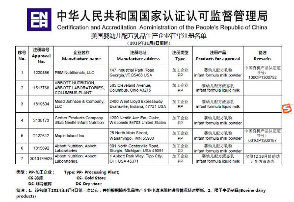 2014年5月,中國(guó)對(duì)境外的乳制品生產(chǎn)實(shí)施注冊(cè),按照規(guī)定,乳制品要賣到中國(guó)去,其生產(chǎn)設(shè)施必須登記和認(rèn)證,并符合中國(guó)的食品安全標(biāo)準(zhǔn)。該協(xié)會(huì)解釋,由于一些原因,在此之前不能將新的美國(guó)乳制品廠添加到中國(guó)的名單上,直到這份諒解備忘錄達(dá)成。 今天,小食代翻查中國(guó)認(rèn)監(jiān)委進(jìn)口乳品境外生產(chǎn)企業(yè)注冊(cè)名單,其中嬰幼兒配方奶粉的名單更新時(shí)間在2015年11月,共有7家美國(guó)奶粉生產(chǎn)商的產(chǎn)品允許對(duì)華出口,包括了雅培、美贊臣、雀巢嘉寶等。
