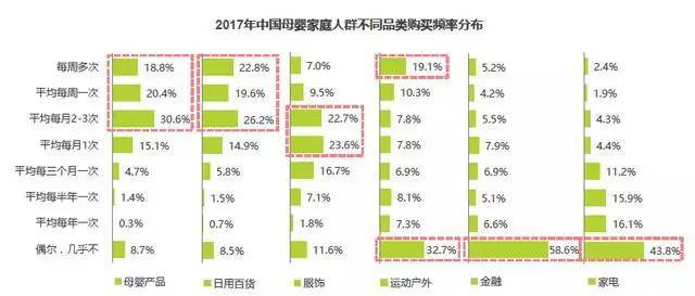 三、母嬰市場的消費(fèi)特點(diǎn) 母嬰產(chǎn)品的消費(fèi)頻次較高,每月購買多次的用戶占比近70% 母嬰家庭人群購買母嬰產(chǎn)品的頻次與日用百貨接近,近70%用戶每月會購買多次。與其他品類相比,母嬰家庭對母嬰產(chǎn)品的消費(fèi)頻次較高。 其他品類中,1)服飾的購買頻率集中于每月1-3次;2)對運(yùn)動戶外產(chǎn)品的購買呈現(xiàn)兩極分化趨勢,19.1%的用戶每周多次購買,32.7%的用戶偶爾購買;3)對金融和家電的購買頻率整體低于其他品類。