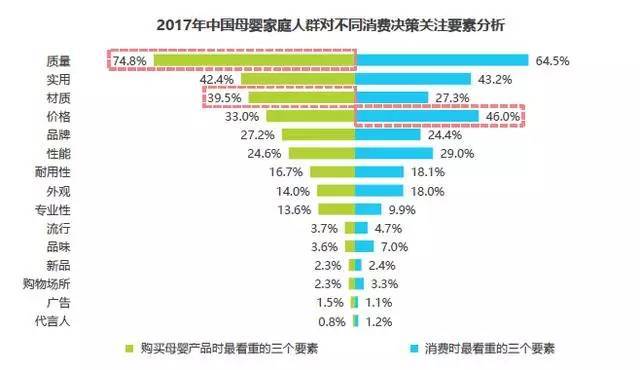 母嬰產(chǎn)品消費(fèi)更注重質(zhì)量和材質(zhì),對價格的敏感性相對較低 與其他類型的消費(fèi)相比,母嬰家庭人群在購買母嬰產(chǎn)品時,更關(guān)注產(chǎn)品的質(zhì)量和材質(zhì),重視度分別達(dá)到74.8%和39.5%,遠(yuǎn)高于進(jìn)行普通消費(fèi)時對它們的重視度。此外,母嬰家庭人群在購買母嬰產(chǎn)品時,對價格的敏感性相對較低,重視度僅為33.0%,遠(yuǎn)低于進(jìn)行普通消費(fèi)時對此的重視度。母嬰產(chǎn)品的質(zhì)量好壞和材質(zhì)情況直接關(guān)系到母嬰健康和安全,因此,大部用戶寧可花費(fèi)較高的價格,消費(fèi)高質(zhì)量、優(yōu)材質(zhì)的母嬰產(chǎn)品。