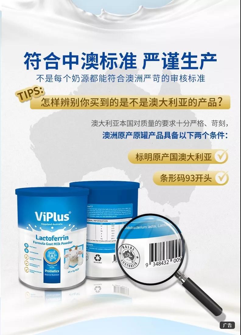 ViPlus乳鐵蛋白山羊調(diào)制乳粉,源自澳洲吉普斯蘭陽光牧場,原裝原罐進(jìn)口,天然無添加;高蛋白、易消化、含有雷特氏B菌、鼠李糖乳桿菌、動物雙歧桿菌三種益生菌,菌落群落總數(shù)是10億 CFU/包(2g),即450億 CFU/罐(90g);全程采用低溫冷提取技術(shù),嚴(yán)格遵守中澳標(biāo)準(zhǔn),產(chǎn)品安全放心。
