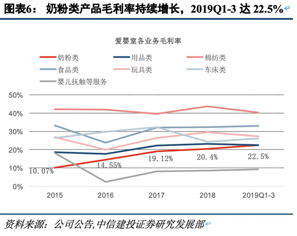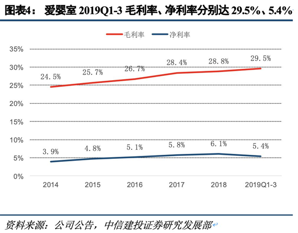 事件 公司發(fā)布三季報(bào):1)2019年前三季度營(yíng)收17.4億元,同增14.52%;歸母凈利潤(rùn)8,726.6萬(wàn)元,同增32.95%;扣非歸母凈利潤(rùn)7,326.9萬(wàn)元,同增33.75%;經(jīng)營(yíng)性現(xiàn)金流2,135.7萬(wàn)元,同減65.9%;ROE(加權(quán))為9.52%,同減0.21個(gè)百分點(diǎn)。2)3Q19單季度營(yíng)收5.62億元,同增11.68%;歸母凈利潤(rùn)2,497.9萬(wàn)元,同增49.46%;扣非歸母凈利潤(rùn)2,237.9萬(wàn)元,同增56.62%。 簡(jiǎn)評(píng) 3Q19營(yíng)收增長(zhǎng)略有放緩。3Q19公司收入同增11.68%,低于1Q19、2Q19分別為13.21%、18.36%的同比增速。其中,門(mén)店端3Q19營(yíng)收5.0億元,占總營(yíng)收比重達(dá)88.6%,營(yíng)收同增12.5%,1Q19、2Q19門(mén)店收入同比增速分別為16.5%、17.9%。分品類(lèi)看,3Q19奶粉類(lèi)收入2.7億元,占營(yíng)收比重的48.25%,奶粉類(lèi)營(yíng)收同增10.21%,低于1Q19、2Q19同比增速18.73%、18.10%的水平。 奶粉類(lèi)產(chǎn)品毛利率改善成為盈利大幅提升的關(guān)鍵。3Q19奶粉類(lèi)產(chǎn)品毛利率達(dá)23.62%,高于1Q19、2Q19奶粉類(lèi)20.49%、23.13%的毛利率水平,3Q19毛利率同增4.3個(gè)百分點(diǎn),對(duì)比來(lái)看,2Q19僅同比提高1.8個(gè)百分點(diǎn)。受益奶粉類(lèi)產(chǎn)品毛利率提升,3Q19公司毛利率達(dá)30.97%,同增3.83個(gè)百分點(diǎn),凈利率為4.80%,同增1.19個(gè)百分點(diǎn)。 三季度加速開(kāi)店,華東地區(qū)開(kāi)店進(jìn)展最快,華南地區(qū)繼續(xù)強(qiáng)化布局。截至2019年9月,公司開(kāi)設(shè)線下門(mén)店266家(上海94家、浙江53家、江蘇55家、福建45家、重慶19家)。其中,1Q19、2Q19、3Q19公司凈開(kāi)設(shè)門(mén)店分別為1、9、15家,4月重慶泰誠(chéng)并表新增18家門(mén)店,2019Q1-3累計(jì)凈增門(mén)店43家(上海10家、浙江7家、江蘇4家、福建3家、重慶19家)。截至2019年9月,公司尚有33家門(mén)店有望于4Q19開(kāi)業(yè)。 盈利預(yù)測(cè):預(yù)計(jì)2019、2020年公司歸母凈利潤(rùn)分別為1.49、1.83億元,同比增長(zhǎng)23.8%、23.3%,對(duì)應(yīng)2019、20年P(guān)E分別為30、24倍。公司是A股母嬰零售行業(yè)唯一上市公司,異地?cái)U(kuò)張持續(xù)推進(jìn),維持“增持”評(píng)級(jí)。