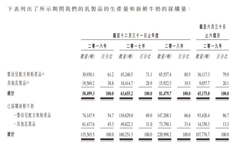 圖片來(lái)源:飛鶴最新聆訊集 雖然預(yù)估的消費(fèi)群體數(shù)量在下降,但得益于奶粉的高端化趨勢(shì),這一市場(chǎng)的零售規(guī)模仍有望繼續(xù)實(shí)現(xiàn)正增長(zhǎng)。 報(bào)告接著提出,由于對(duì)高端產(chǎn)品的需求增加,嬰幼兒配方奶粉價(jià)格也在持續(xù)上漲。預(yù)計(jì)在2018~2023年間,中國(guó)嬰幼兒配方奶粉市場(chǎng)零售銷量的復(fù)合年增長(zhǎng)率為3.8% 事實(shí)上,飛鶴近年來(lái)也一直強(qiáng)調(diào)高端化,并打造出了定位超高端、年銷售額超50億的“星飛帆”。 在上一次披露的聆訊集中,星飛帆也被列在競(jìng)爭(zhēng)優(yōu)勢(shì)中,說(shuō)法是“領(lǐng)先的品牌,而其中一款超高端產(chǎn)品在主要品牌中增長(zhǎng)最快”。但在最新文件中,飛鶴將上述說(shuō)法修改為“領(lǐng)先的品牌,超高端產(chǎn)品增長(zhǎng)在主要品牌中為最快之一”,不再單獨(dú)點(diǎn)名星飛帆。 目前,飛鶴旗下共有兩款超高端產(chǎn)品:星飛帆和臻稚有機(jī),后者在2017年4月上市。文件還提到,與星飛帆相比,臻稚有機(jī)產(chǎn)品以更高的價(jià)格出售,以防止產(chǎn)品自相蠶食。截至2019年6月30日止的六個(gè)月內(nèi),臻稚有機(jī)的銷售額為26.96億人民幣,同比增長(zhǎng)4.6%。 小食代還留意到,高端產(chǎn)品及星飛帆最新披露的毛利率也較之前有所提高。在上一份文件中,截至2019年6月30日的六個(gè)月內(nèi),高端產(chǎn)品和星飛帆的毛利率分別為71.9%及73.5%。而在日期不變的情況下,最新數(shù)字被修改為73.5%及76.3%。 除了預(yù)估出生人口和毛利率的新數(shù)據(jù),飛鶴還首次披露了過往幾年的產(chǎn)量數(shù)據(jù)。 比較往年數(shù)據(jù)可以發(fā)現(xiàn),其嬰幼兒奶粉產(chǎn)量實(shí)現(xiàn)了“三年翻一倍”的增長(zhǎng),從2016年的3.09萬(wàn)噸上升至2018年的6.56萬(wàn)噸。與此同時(shí),其它乳制品(注:主要包括液態(tài)奶和成人奶粉)的產(chǎn)量則在逐年下降。這意味著,飛鶴的業(yè)務(wù)重心正在快速向嬰幼兒奶粉傾斜。