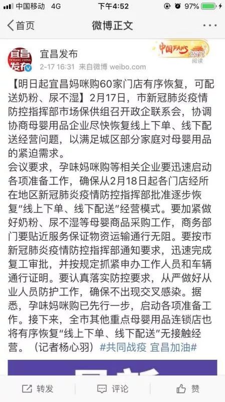 顯然,最近一段時間,媒體聯(lián)合渠道一同發(fā)出“保障疫區(qū)口糧供應(yīng),將嬰幼兒奶粉作為重點民生物資”的倡議得到了響應(yīng),努力終不被負。 與這種倡議有異曲同工之妙的是,湖北宜昌孕味媽咪購的做法,拿到了當?shù)厣虅?wù)局出具的“委托采購函”,與政府協(xié)同解決不失為一種智慧的做法,孕味媽咪購總經(jīng)理王春蓮?fù)嘎叮?ldquo;大家可以直接找到各地商務(wù)局去溝通,審批流程不復(fù)雜,不過要(準備)有明確的訴求,建議大的連鎖可以試試。”