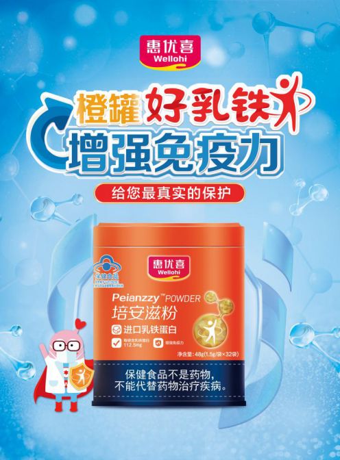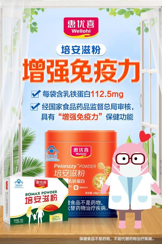 科學(xué)選擇乳鐵蛋白 無(wú)論是含量,還是額外添加,都是為了保證乳鐵蛋白的起效劑量。認(rèn)準(zhǔn)這一點(diǎn),就能科學(xué)選擇乳鐵蛋白產(chǎn)品,以惠優(yōu)喜旗下的培安滋乳鐵蛋白粉為例。 首先,要看配料表,是否有額外添加乳鐵蛋白。 在培安滋乳鐵蛋白粉中,我們可以清晰地看到“乳鐵蛋白”字樣,這是作為單獨(dú)添加的重要依據(jù)。值得注意的是,培安滋乳鐵蛋白粉采用的是進(jìn)口雙蛋白配方,即進(jìn)口乳清蛋白粉原料+進(jìn)口乳鐵蛋白原料。 其次,看主要成分的含量是否能夠保證起效。 培安滋乳鐵蛋白粉每100g含乳鐵蛋白7.5g(每袋含乳鐵蛋白112.5mg,每罐含乳鐵蛋白3600mg),這保證了起效食用量每次都在100mg或以上,充分補(bǔ)充了足量的乳鐵蛋白。 最后,惠優(yōu)喜培安滋乳鐵蛋白還具備一大加分優(yōu)勢(shì)——保健食品批文,該批文的保健功能是增強(qiáng)免疫力。 在上篇《十年前就布局培安滋乳鐵蛋白,惠優(yōu)喜這樣預(yù)判營(yíng)養(yǎng)品市場(chǎng)》中,程彥講述了培安滋乳鐵蛋白粉誕生的“辛酸”歷程以及等待批文的漫長(zhǎng)歷程,“這不僅是國(guó)家對(duì)我們產(chǎn)品的檢驗(yàn),更是對(duì)配培安滋乳鐵蛋白粉的認(rèn)可。” 如今,正是全民關(guān)注免疫力的時(shí)代,培安滋粉乳鐵蛋白粉作為惠優(yōu)喜旗下首個(gè)免疫力品類的大單品切入市場(chǎng),且看它順勢(shì)而為,乘勢(shì)而上,成為免疫品類市場(chǎng)的中流砥柱。