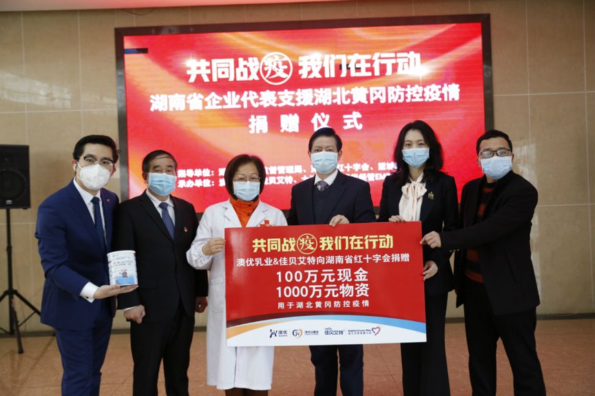 【共同戰(zhàn)“疫”我們在行動】捐贈儀式現(xiàn)場合影 湖南省紅十字會黨組書記、常務(wù)副會長陳丹萍表示:“疫情面前全國人民的心手相連,我們呼吁更多像澳優(yōu)乳業(yè)一樣的愛心企業(yè)加入到全國疫情的防控之中,緩解了疫區(qū)防控保障物資的燃眉之急,點燃疫區(qū)人民希望之燈。” 早在2月7日,國務(wù)院建立了“一省包一市”的方式,舉全國之力抗擊疫情,湖南被分配對口支援黃岡的醫(yī)療救助。此次捐贈的1000萬佳貝艾特羊奶粉將用于為湖北黃岡的醫(yī)務(wù)人員、戰(zhàn)斗在一線的防疫工作者、確診與疑似患者以及受困家庭提供營養(yǎng)支持。 捐贈儀式上,澳優(yōu)董事長顏衛(wèi)彬表示:“新冠肺炎疫情讓整個國家都陷入了巨大的困難之中,作為一家保障民生的營養(yǎng)食品企業(yè),澳優(yōu)全力以赴,一方面積極響應(yīng)國家市場監(jiān)管總局啟動的‘保價格、保質(zhì)量、保供應(yīng)’三保行動,切實保障產(chǎn)品的穩(wěn)定供應(yīng),保證嬰幼兒的口糧;另一方面,我們在加強(qiáng)內(nèi)部防控的同時,也積極加入到疫情馳援行動之中,為保證全面抗‘疫’的勝利貢獻(xiàn)力量。”