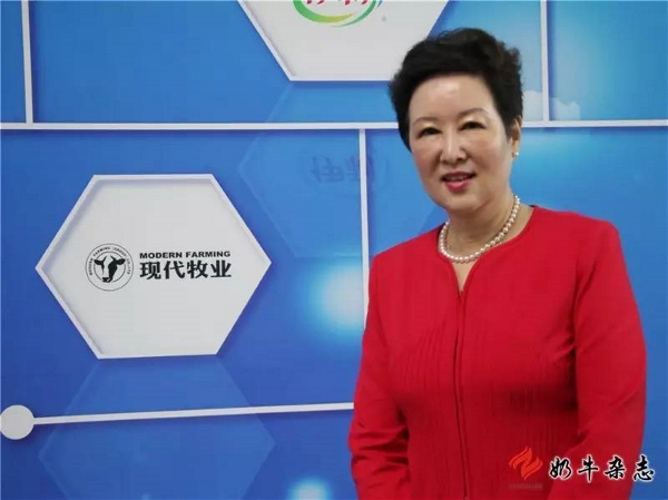 現(xiàn)代牧業(yè)董事長兼總裁高麗娜在企業(yè)展板前留影