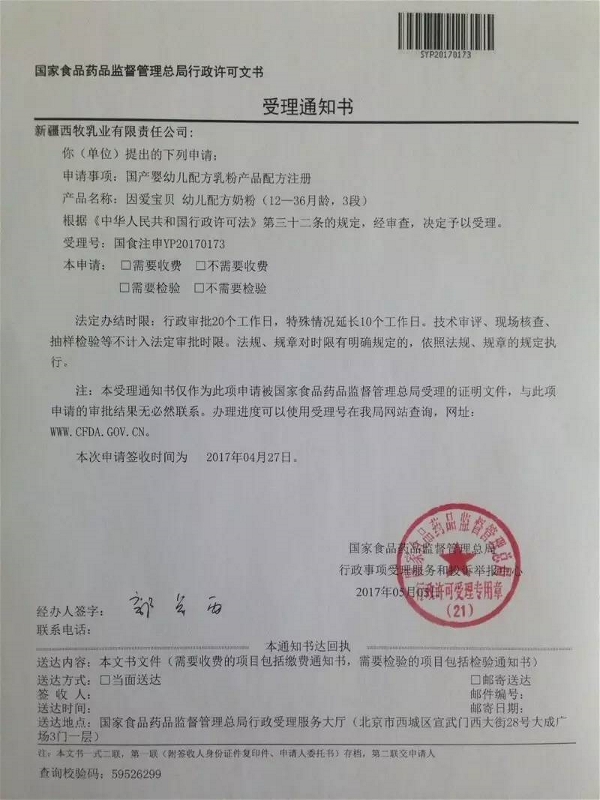 對(duì)于這項(xiàng)牽一發(fā)而動(dòng)全身的新政,只要是奶粉從業(yè)者,無(wú)論是生產(chǎn)者還是銷(xiāo)售人員,都時(shí)刻繃緊神經(jīng),翹首以盼。但因?yàn)檫@項(xiàng)政策具有連貫性,且對(duì)外存在部分保密性,于是,監(jiān)管部門(mén)、生產(chǎn)企業(yè)和渠道從業(yè)者以及消費(fèi)者之間,存在一定的信息不對(duì)稱(chēng)。 上周,食悟君的微信朋友圈流傳出一份《受理通知書(shū)》,在一定程度上反映了配方注冊(cè)目前的最新進(jìn)展。這份蓋有國(guó)家食品藥品監(jiān)督管理總局行政許可受理專(zhuān)用章的受理通知書(shū),是下發(fā)給新疆西牧乳業(yè)有限責(zé)任公司(西部牧業(yè)子公司)的,“經(jīng)審查,決定予以受理”西牧乳業(yè)提交的“因愛(ài)寶貝 幼兒配方奶粉(3段)”的配方注冊(cè)申請(qǐng)。