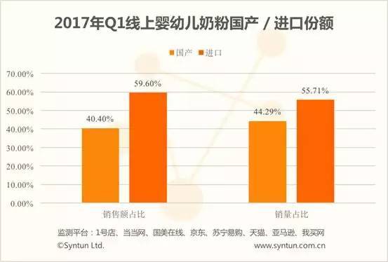 盡管線上嬰幼兒奶粉市場(chǎng)整體利好,但是國(guó)產(chǎn)品牌依然不容樂觀,進(jìn)口對(duì)于國(guó)內(nèi)奶粉制造業(yè)的沖擊很大,從數(shù)據(jù)來看,1季度國(guó)產(chǎn)銷售份額有進(jìn)一步縮小的趨勢(shì)。國(guó)產(chǎn)奶粉僅保住線上奶粉市場(chǎng)4成份額,占比為40.4%,這個(gè)數(shù)字較16年同期也是有所下降的。不僅線上如此,線下情況也類似,據(jù)尼爾森17年1月數(shù)據(jù)顯示,在全國(guó)商超和母嬰渠道中,本土品牌的市場(chǎng)份額只有34.4%,而作為國(guó)產(chǎn)奶粉核心渠道的母嬰渠道中進(jìn)口品牌也占到5成以上。
