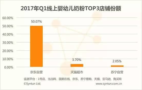 下圖為星圖數(shù)據(jù)監(jiān)測(cè)到的線上奶粉市場(chǎng)銷售額排名前三位的店鋪,京東自營(yíng)銷售以50.07%的占比遙遙領(lǐng)先,天貓超市也僅有3.70%,京東自營(yíng)的能力可見一斑。16年京東與天貓的市場(chǎng)份額差距還未如此懸殊,雖然京東在嬰幼兒奶粉領(lǐng)域一直領(lǐng)先,但天貓也是步步緊逼,京東的份額也一直在5成左右徘徊。京東自營(yíng)的成功一方面受行業(yè)變化的影響,另一方面我們也能看到京東去年下半年以來在營(yíng)銷、數(shù)據(jù)及物流等領(lǐng)域的發(fā)力。在嚴(yán)峻的形勢(shì)下,本土奶粉品牌不能再抱殘守缺,國(guó)家及政策等的扶持不能演變成一場(chǎng)奶粉企業(yè)的“捧殺”,除了產(chǎn)品、營(yíng)銷等方面尋求突破外,要努力發(fā)展多渠道策略,提升自身的競(jìng)爭(zhēng)力。