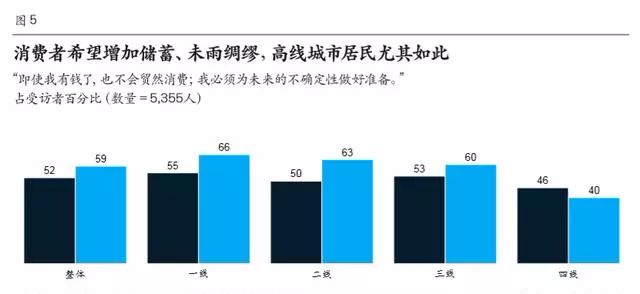 實際上,中低線城市消費者之所以日益重要,與京東、天貓、拼多多等電商平臺的崛起息息相關(guān)。因為電商平臺在一定程度上幫助品牌商把銷售渠道延伸到低線城市,推動了低線城市富裕年輕人增加消費支出。如今,消費者可以通過拼多多購買到1000多種品牌的商品,占這些品類在該平臺全部銷售量的10%至30%。 趨勢二:多數(shù)消費者出現(xiàn)消費分級,在升級的同時有的更關(guān)注品質(zhì)、有些更關(guān)注性價比等 60%的受訪者表示,即使感覺富有,但仍希望把錢花在“刀刃上” 盡管經(jīng)濟增速放緩似乎并未影響到“年輕購物達人”,但大多數(shù)中國消費者并非如此。絕大多數(shù)受訪者在支出方面都表現(xiàn)得更加謹(jǐn)慎。約60%的受訪者告訴我們,即使自己感覺比較富有,但仍希望把錢花在“刀刃上”,這一比例高于2017年的52%(圖5)。 這背后的原因不難理解。2012年至2018年,中國城市居民人均消費增長了65%,遠遠超過通貨膨脹率和GDP增長率,而同期的收入增長卻在放緩。中國人均可支配收入增長已經(jīng)從2012年的13%下降到2018年的9%。 但消費者應(yīng)對經(jīng)濟緊縮的方式不盡相同,在較為謹(jǐn)慎的消費者群體中,我們發(fā)現(xiàn)了幾類代表性人群——有的人仍在增加支出,也會為高檔商品支付更高價格;但也有的調(diào)整了消費方向,開始努力省錢。 品味中產(chǎn):這一群體以忙碌而富有的中年人為代表,他們跟消費新生代一樣富裕。但與后者不同的是,“品味中產(chǎn)”群體更加看重品質(zhì),他們愿意為高品質(zhì)商品付出昂貴的價錢,但是并不愿意單單為了凸顯自己的社會地位而買單。 “品味中產(chǎn)”在我們調(diào)研的25個品類中的23個增加了支出,為2018年消費支出增長貢獻了23%。