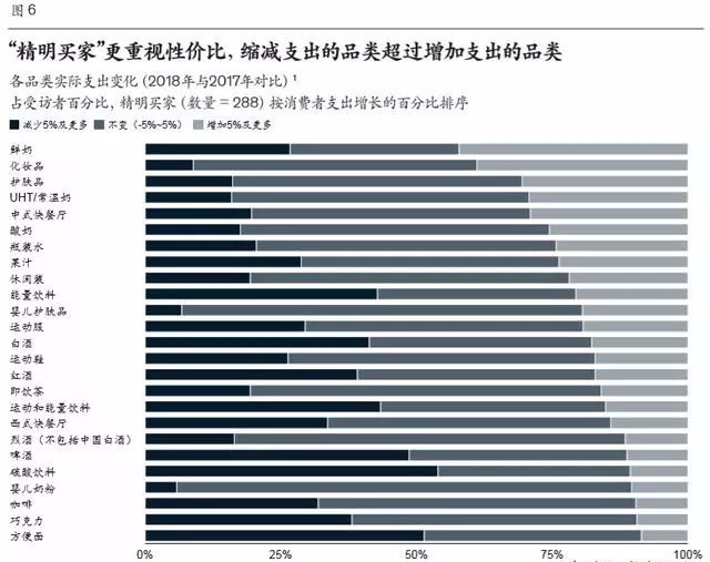 精明買家:這一群體也青睞更高品質(zhì)的產(chǎn)品,但由于其收入略低于“品味中產(chǎn)”和“購物達人”,因此,他們時刻追求最高的性價比,既要品質(zhì)過關(guān),又要價格合理。事實上,他們減少支出的品類已經(jīng)超過了增加支出的品類(圖6)。 精明買家生活穩(wěn)定,所以無論是經(jīng)濟上還是個人生活上,都有大把時間和足夠動力去仔細評估不同產(chǎn)品,找到物美價廉、經(jīng)久耐用的商品。如果給這類消費群體畫像的話,她們往往是已婚、中年、女性、生活在成本較高的一線城市。他們僅為2018年消費支出增長貢獻了6%。