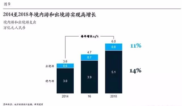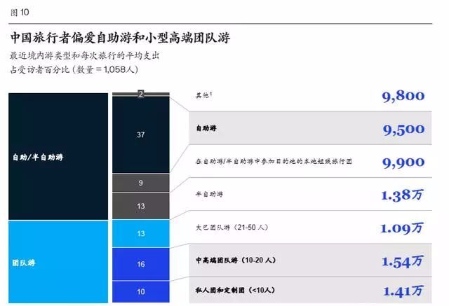 60%的消費者會經(jīng)常查看包裝食品成分表 大城市中,60%的消費者表示會經(jīng)常查看包裝食品的成分表,會購買看起來更健康的產(chǎn)品。在我們追蹤的25個商品品類中,鮮奶是2018年中國消費者同比支出增長最多的一項。半數(shù)受訪者表示,他們會購買更多鮮奶,還有38%的受訪者表示會購買更多酸奶。“年輕購物達人”則對天然原料制作的酸奶情有獨鐘。55%的受訪者表示“健康和天然原料”是他們購買產(chǎn)品時的首選因素,此外“無糖”、“有機”等概念也比較重要。 有趣的是,高線城市和低線城市消費者的健康理念有著微妙差別。低線城市消費者也崇尚健康生活方式,但他們支出增長最多的品類卻包括碳酸飲料和果汁,可見他們對健康生活方式的理解不同于高線城市消費者。 趨勢四:旅行消費更注重體驗 常言道“讀萬卷書不如行萬里路”。為了開闊視野、增加生活樂趣,中國消費者旅行熱情非常高。2014年至2018年,中國城市消費者旅行支出的年復(fù)合增長率為14%,超過GDP增長率(7%)(圖9)。 隨著中國消費者旅行次數(shù)增加、旅行經(jīng)驗豐富,他們在 行程規(guī)劃時也更加成熟和有辨別力。在國內(nèi)游方面,超過 60% 的受訪者表示,他們現(xiàn)在更偏愛自助游,而非10年前流行的大型團隊游(圖10)。 這在一線城市尤其明顯(80%的受訪者更青睞自助游)。如果選擇團隊游,越來越多的中國旅行者會選擇小型、高端旅行團。45歲及以上年齡的消費者更喜歡小型團隊游(32%的受訪者偏愛這種 方式)。