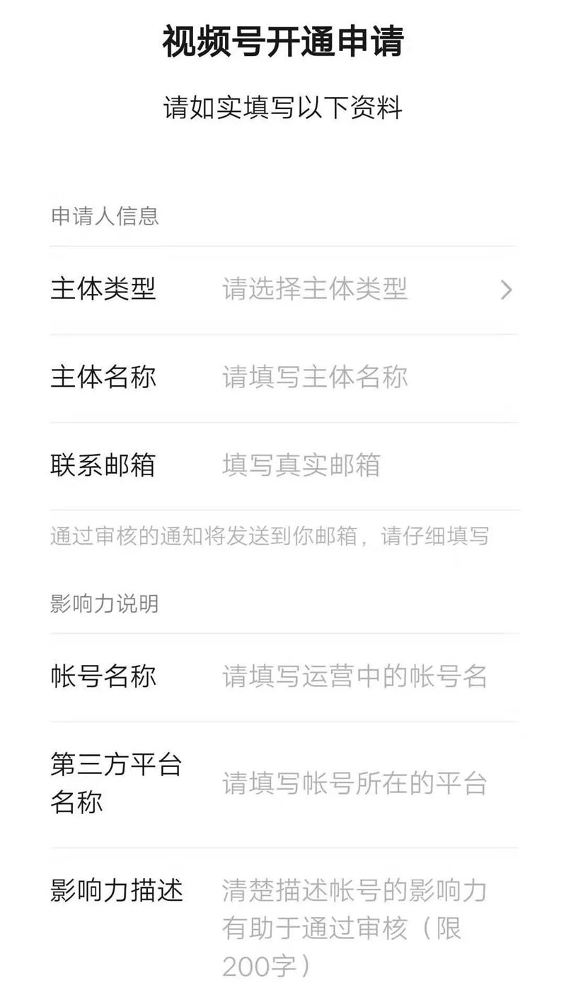 不過,想要申請(qǐng)「視頻號(hào)」也是有著條件的!前面的申請(qǐng)人信息不用我多說,最重要的還是要填寫第三方運(yùn)營(yíng)中的賬號(hào)、名稱和影響力證明等。 比如快手、抖音,頭條等等這些短視頻平臺(tái)的證明都可以,沒有的話小伙伴們可以去可以去注冊(cè)一個(gè),隨便發(fā)表一些視頻,畢竟視頻號(hào)的目的還是吸引一些優(yōu)質(zhì)的短視頻自媒體入駐的。