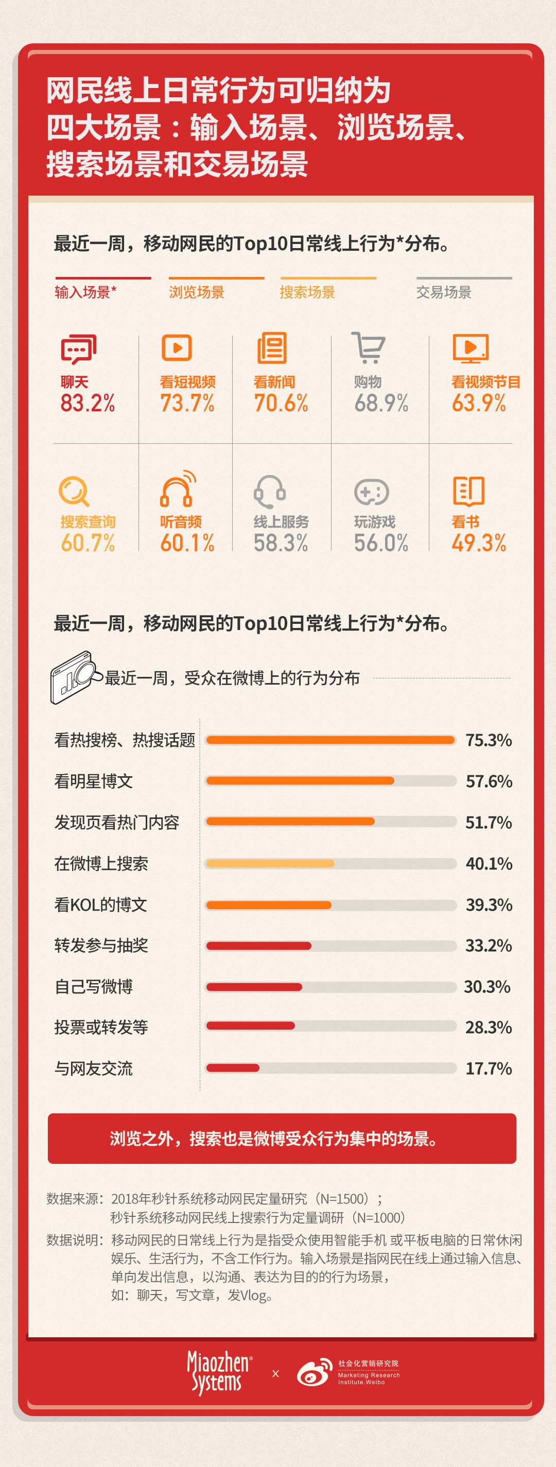 在媒體消費(fèi)場景中,搜索場景是品牌的經(jīng)典營銷觸點(diǎn)。消費(fèi)者線上內(nèi)容消費(fèi)習(xí)慣的變化,引發(fā)搜索習(xí)慣的變化。這令品牌不得不隨時(shí)調(diào)整策略,更加科學(xué)地把握搜索場景。而我們所稱的“搜索”,并不僅僅局限于搜索引擎,而是所有具備搜索功能的平臺,尤其是將搜索與其它功能結(jié)合的平臺,如微博。 微博作為社會化媒體,天生具備社交屬性;而作為新興的媒體平臺,又具備資訊屬性;而微博的互動產(chǎn)品設(shè)計(jì),又使得它具備娛樂屬性的場域性。那么,當(dāng)微博與搜索場景相結(jié)合,品牌應(yīng)如何把握觸點(diǎn)價(jià)值,發(fā)現(xiàn)營銷機(jī)會,優(yōu)化營銷策略? 日前,秒針系統(tǒng)與微博旗下社會化營銷研究院共同發(fā)布《微博搜索價(jià)值與營銷策略研究報(bào)告》(以下簡稱《報(bào)告》),基于大量數(shù)據(jù),從搜索的差異性、意圖性和趨同性對其價(jià)值進(jìn)行深入剖析,并基于微博搜索的傳播特征為品牌和廣告主提供有效營銷策略建議,以期為品牌廣告主和行業(yè)今后在營銷中提供借鑒與參考。 場景,精細(xì)化的流量入口 網(wǎng)民在線上的日常行為,可歸納為四大場景:輸入場景、瀏覽場景、搜索場景和交易場景。根據(jù)《報(bào)告》,最近一周,移動網(wǎng)民的Top10日常線上行為分布中,聊天占83.2%,看短視頻和新聞分別為73.7%和70.6%。接下來依次為購物、看視頻節(jié)目、搜索查詢、聽音頻、線上服務(wù)、游戲和看書。