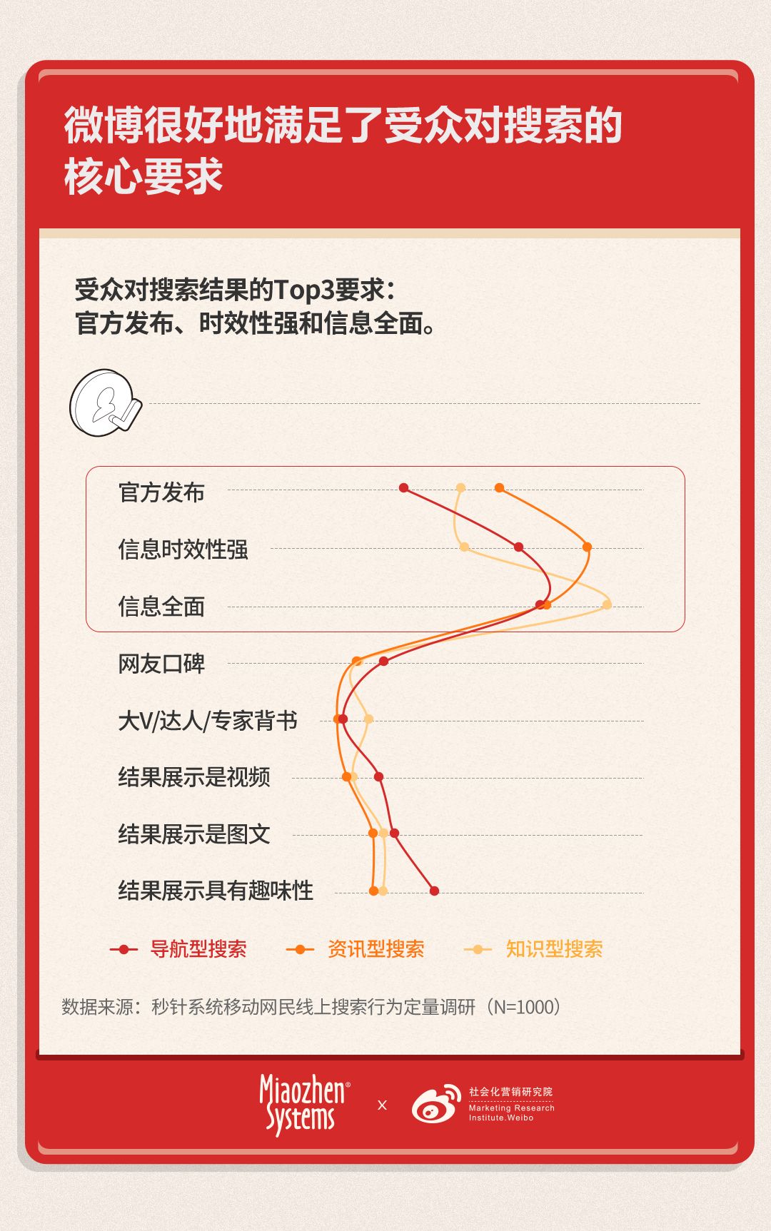 因此,品牌的媒介策略重點(diǎn)需要向內(nèi)容/社交媒體轉(zhuǎn)移。某美妝品牌數(shù)字媒介經(jīng)理表示:“搜索引擎的投放是常規(guī)的,預(yù)算絕對值基本上是穩(wěn)定的。未來這部分預(yù)算量級可能會略縮小,因?yàn)橄M(fèi)者收集信息的渠道更多了,搜索引擎的作用被稀釋。未來我們會更多考慮投放微博、微信這類社交媒體上的搜索。” 搜索的意圖性幫助品牌捕捉興趣人群 搜索是具有明顯意圖的自主行為,意味著受眾的興趣與關(guān)注。受眾的搜索目的,通常為填補(bǔ)認(rèn)知空白、了解更多信息、查找特定對象,即知識型搜索、資訊型搜索和導(dǎo)航型搜索。 微博搜索受眾對商品介紹、生活信息和新品發(fā)布等消費(fèi)信息最感興趣。與整體搜索受眾相比,受眾對明星/名人動態(tài)、活動信息、短視頻/Vlog的興趣更濃厚。 受眾對搜索結(jié)果的Top3要求為:官方發(fā)布、時(shí)效性強(qiáng)和信息全面,微博搜索能滿足受眾對搜索的核心需求。其中,67.5%認(rèn)為在微博上搜新品信息,結(jié)果是比較權(quán)威的,因?yàn)槭枪俜阶约旱陌l(fā)布,細(xì)節(jié)比較全,比較及時(shí),也更具體。84.7%認(rèn)為微博搜出來的是實(shí)時(shí)的,比較新的一手信息,而其他渠道相對比較滯后。88.1%認(rèn)為微博的發(fā)布品牌比較綜合,美食、美妝、數(shù)碼、汽車等品類的都包括在內(nèi),非常全面。