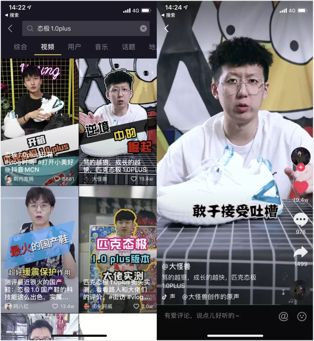 勢頭起來后,再安排運動、好物、國貨接力助推,同時抖音上鞋類大號同步測評,而微博則在搬運中起到延長傳播。 憑著國貨科技火到國外這一策略,毒角SHOW個人在抖音、微博、騰訊視頻等多個平臺總共帶來1440萬播放,抖音252萬點贊量達到其歷史第一,實際帶貨效果非常好,當(dāng)然態(tài)極產(chǎn)品本身的產(chǎn)品力也是根本。 出口轉(zhuǎn)內(nèi)銷的策略有時也需要針對品類做具體措施。匹克態(tài)極籃球鞋戰(zhàn)役中,贊意策劃再次邀請毒角SHOW合作,先是美國鞋王店長(中國90后)買入態(tài)極籃球鞋并高價出售,后讓毒角SHOW到店內(nèi)做采訪,道出鞋王賣態(tài)極是因為認(rèn)可態(tài)極的產(chǎn)品力,認(rèn)為中國終于有抗衡國外品牌的核心科技了,最后再在球場找球迷實際眾測大獲專業(yè)好評……當(dāng)期毒角SHOW視頻獲得266萬點贊量火爆刷新其抖音記錄,結(jié)果就是態(tài)極籃球鞋銷售數(shù)據(jù)直線上升。 這一系列組合下來已經(jīng)不是簡單的出口轉(zhuǎn)內(nèi)銷了,實際是一條兼具國外權(quán)威銷售認(rèn)可+產(chǎn)品溢價能力+受眾專業(yè)眾測的策略,產(chǎn)品好+國貨爭光的戰(zhàn)狼體宣傳之下帶貨效果不言而喻。 所以出口轉(zhuǎn)內(nèi)銷的種草和拔草,關(guān)鍵是點要找好-梗要埋巧-引爆要騷。