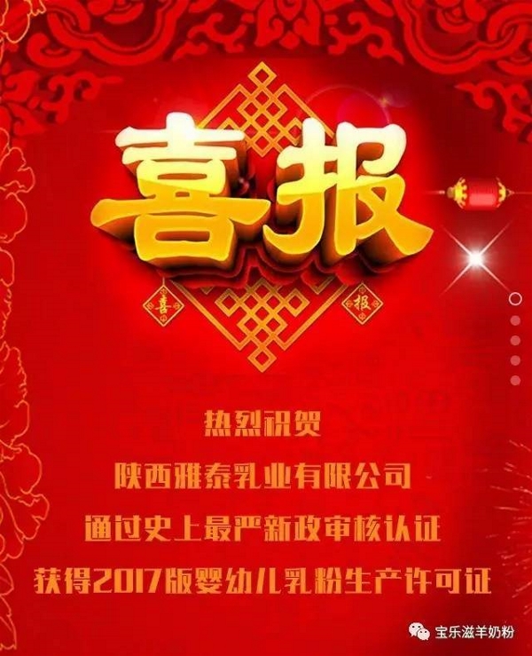 回顧歷史首批通過生產(chǎn)許可 2013年,國家食品藥品監(jiān)督管理總局征集社會各界意見8970多條,制定了《嬰幼兒配方乳粉生產(chǎn)許可審查細則(2013年版)》,對嬰幼兒配方乳粉實行參照藥品管理辦法進行管理。根據(jù)新規(guī)的嚴格程度,能通過審核的企業(yè)是真正能生產(chǎn)安全、健康、放心的奶粉的企業(yè)。 2014年4月13日,陜西雅泰乳業(yè)在全國128家嬰幼兒奶粉生產(chǎn)企業(yè)中脫穎而出,雅泰乳業(yè)一次性順利通過嬰幼兒配方乳粉生產(chǎn)許可證換證審核,首批獲得生產(chǎn)許可證書! 17年再次首批通過生產(chǎn)許可 近日,國家食品藥品監(jiān)督管理總局對雅泰乳業(yè)生產(chǎn)基地、嬰幼兒配方乳粉生產(chǎn)許可證相關(guān)細則進行了審核,經(jīng)過專家組嚴格、細致、認真的核查,雅泰乳業(yè)順利通過“2017版嬰幼兒配方奶粉生產(chǎn)許可證“現(xiàn)場審核,于4月27日首批獲得生產(chǎn)許可證書。 雅泰乳業(yè)順利通過此次“史上最嚴”審核,這意味著國家對雅泰乳業(yè)品質(zhì)最權(quán)威的肯定和認可。