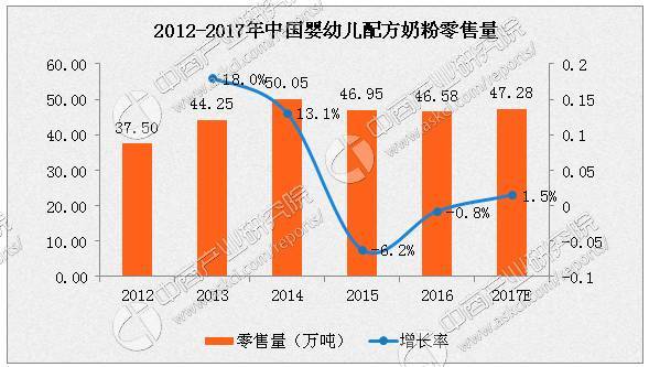 數(shù)據(jù)來(lái)源:中商產(chǎn)業(yè)研究院整理 中國(guó)的嬰幼兒配方奶粉零售量由2012年的37.5萬(wàn)噸增至2016年的46.58萬(wàn)噸,復(fù)合年增長(zhǎng)率為5.6%。中國(guó)嬰幼兒配方奶粉市場(chǎng)零售量的增長(zhǎng)趨勢(shì)與零售額相仿,而其復(fù)合年增長(zhǎng)率較零售額為低,主要因高端產(chǎn)品的需求增加導(dǎo)致嬰幼兒配方奶粉產(chǎn)品的價(jià)格持續(xù)增長(zhǎng)所致。在高端嬰幼兒配方奶粉市場(chǎng)的帶動(dòng)下,估計(jì)中國(guó)嬰幼兒配方奶粉市場(chǎng)的零售量將從2016年的46.58萬(wàn)噸以2.2%的復(fù)合年增長(zhǎng)率增長(zhǎng),2017年預(yù)計(jì)達(dá)到47萬(wàn)噸以上。