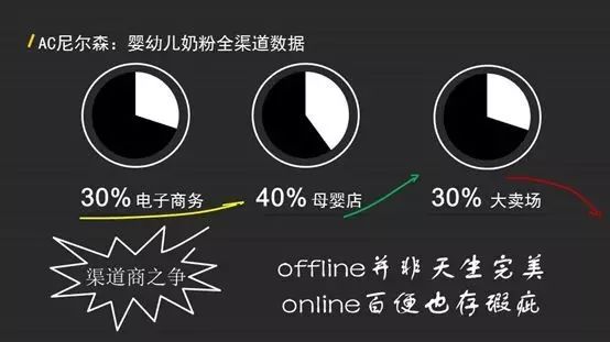 這是尼爾森在2015年發(fā)布的一個(gè)奶粉全渠道數(shù)據(jù),這說(shuō)明,線(xiàn)上和線(xiàn)下并一定是對(duì)立的,線(xiàn)下并不一定會(huì)被線(xiàn)上吞沒(méi),雙方在場(chǎng)景消費(fèi)里面都有席位,所以offline(線(xiàn)下)并非天生完美,online(線(xiàn)上)方便也存在瑕疵。有人拿了風(fēng)投的錢(qián),有人把渠道做的在線(xiàn)上和線(xiàn)下占有一定席位。商業(yè)本身會(huì)趨向于利,有了錢(qián)之后必然會(huì)為了增長(zhǎng)形成一定程度的壟斷,無(wú)論是線(xiàn)下去做線(xiàn)上的商城,還是線(xiàn)上去做線(xiàn)下的實(shí)體店,這些試圖做全渠道的事情,能不能成功現(xiàn)在也不好說(shuō)。先給大家分析下面這幾張圖。